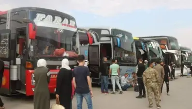 بحماية مروحيات عراقية زوار شيعة يدخلون على متن حافلات كبيرة باتجاه ديرالزور