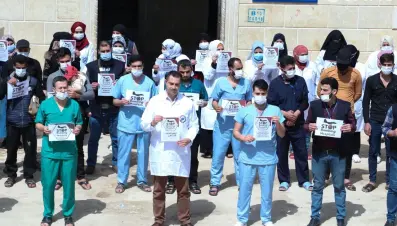 تنديداً بقصف المشافي.. وقفة احتجاجية للكوادر الطبية بريف إدلب