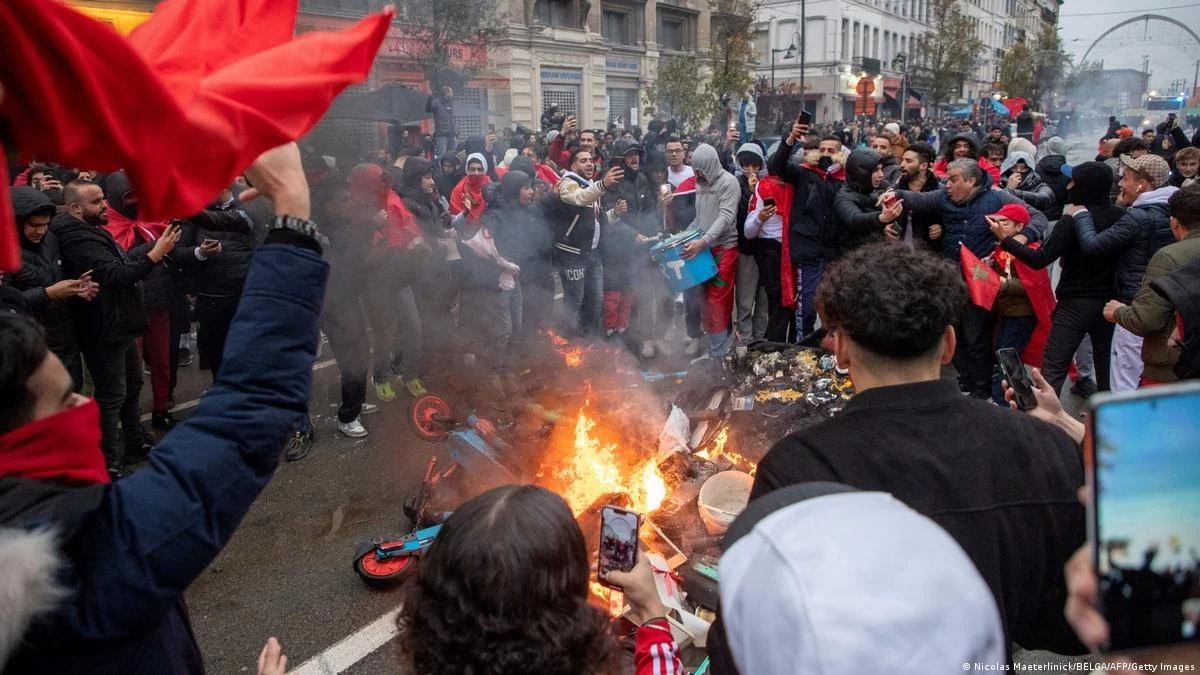 وقبل ذلك، شهدت شوارع العاصمة البلجيكية بروكسل مساء الأحد أيضاً أعمال شغب بعد فوز المنتخب المغربي على البلجيكي، حيث تجول مغاربةٌ بسياراتهم في أنحاء المدينة فرحا بالفوز مطلقين أبواق السيارات.