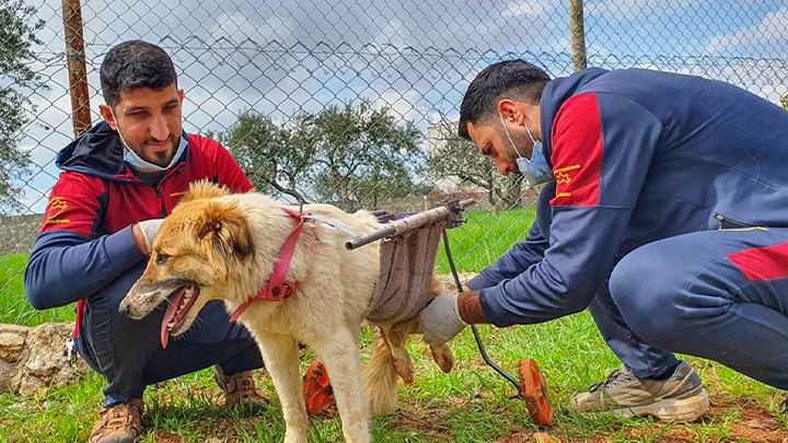 تمكن منقذون في شمال غربي سوريا، من إنقاذ كلب بعد إصابته في العمود الفقري والقدمين الخلفيتين من خلال احتضانه ومعالجته وتوفير كرسي متحرك له.
