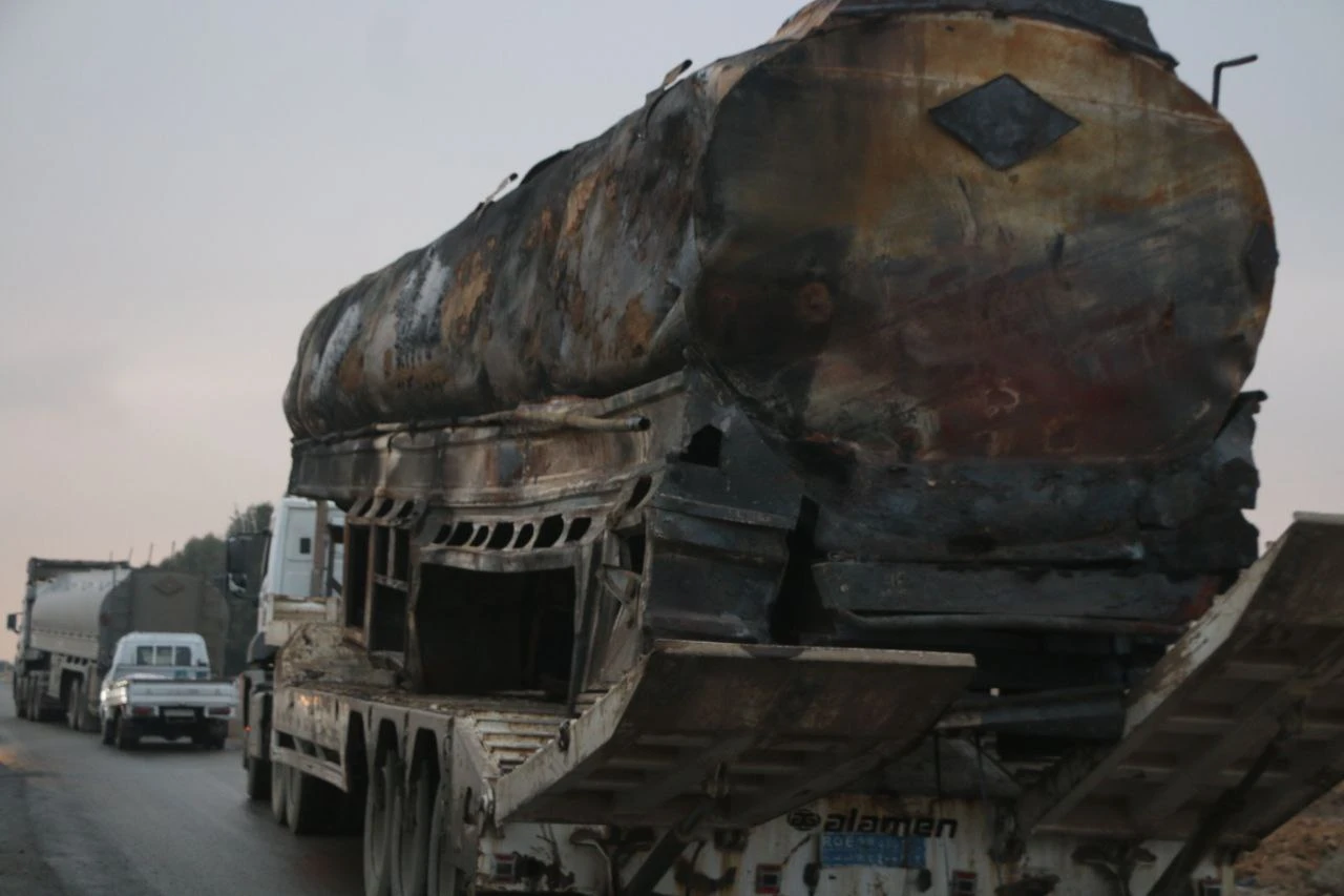 وبحسب موقع "أثر برس" الموالي، فإن قافلة نفط تعرضت لهجوم مسلح؛ وأدى الهجوم لمقتل سائقين مع مرافقيهما، واحتراق 4 صهاريج، فيما قُتل 3 عناصر من المهاجمين على الأقل وأصيب آخرون.