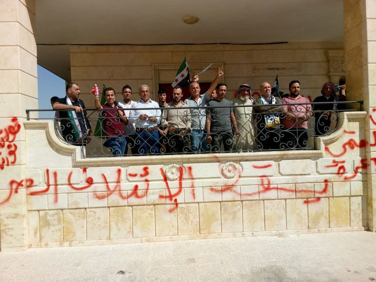 وكتب المحتجون عبارات مناهضة للائتلاف على الجدران الخارجية للمبنى مثل: "يسقط الائتلاف" و"يسقط العملاء".