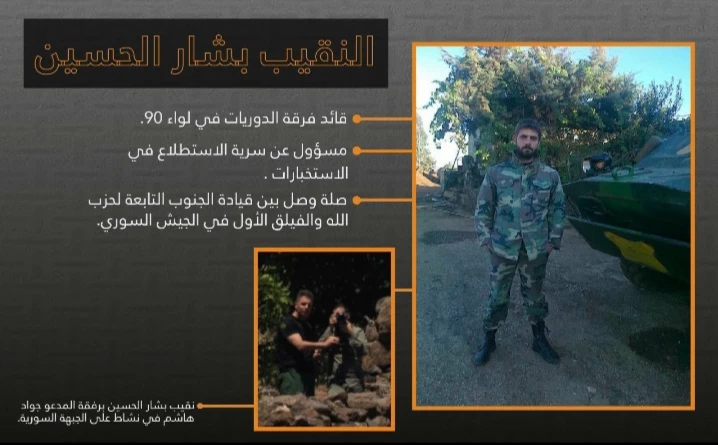 وأوضح أن اسم الضابط هو بشار الحسين، ويعمل قائدا لسرية في اللواء 90، ويسكن في حي عكرمة بحمص، ووصفه بأنه "صلة الوصل" بين قيادة الفيلق الأول للجيش السوري، وبين قيادة الجنوب التابعة لحزب الله، وهو على تعاون وثيق مع "الحاج هاشم"، مسؤول قيادة الجنوب.