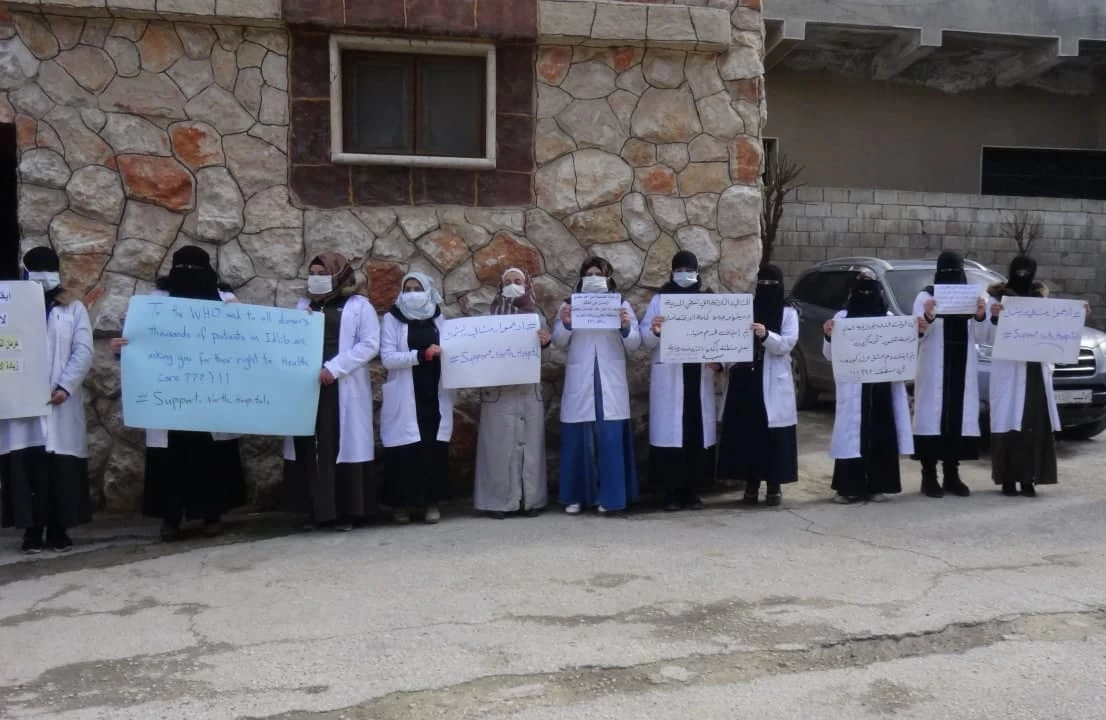 نظمت الكوادر الطبية العاملة في مدينة كفر تخاريم بريف إدلب الغربي، السبت، وقفة احتجاجية للمطالبة بدعم مستشفيات الشمال المحرر التي توقف دعمها من قبل المنظمات المانحة خلال الشهور الثلاثة الفائتة.