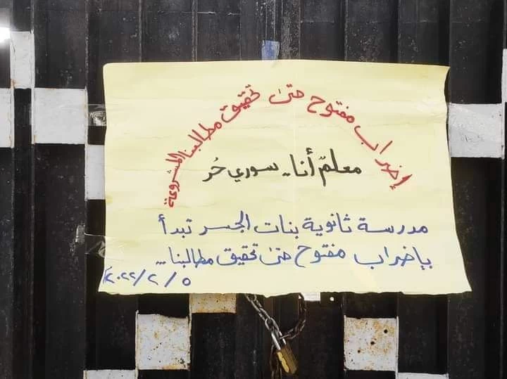 يتواصل إضراب الكوادر التدريسية العاملة في تربية إدلب وحماة الحرة لليوم العشرين على التوالي "الكرامة للمعلمين" وسط إغلاق عشرات المدارس أبوابها بوجه الطلاب بشكل نهائي حتى تنفيذ مطالب المشاركين بالإضراب وتأمين حقوقهم.
