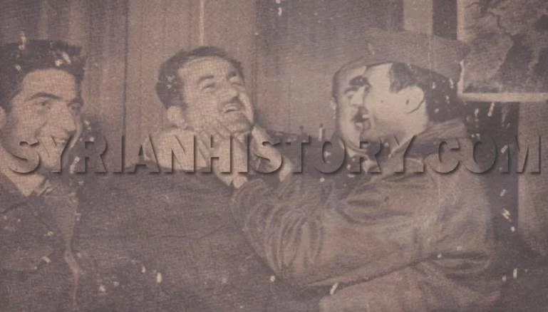 وواجهت سياسات الشيشكلي الجدار، عندما انتفض الدروز سنة 1954، فقصف بعض قراهم بالطائرات، وسرعان ما تشكل حلف كبير من ضباط الأقليات، أرغمه على الهرب من البلاد سراً. (الصورة إلى اليسار: اللواء سامي الحناوي، ميشيل عفلق، أسعد طلس، وصلاح البيطار... بعد نجاح انقلاب الحناوي)
