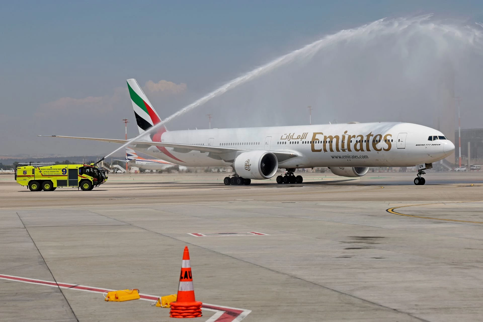 واستُقبلت الرحلة رقم EK931 التي تقل 335 راكباً، بتحية مائية لدى هبوطها على مدرج مطار بن غوريون في تل أبيب.